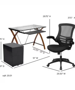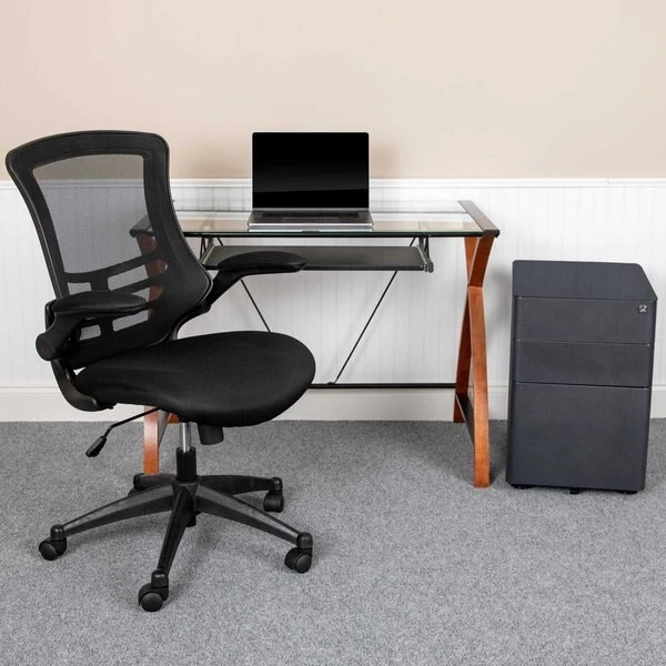 If you're looking to revive your home office a glass computer desk will bring your office up-to-date. This desk and chair set with filing cabinet is a great start for your new business venture. Having pleasant office seating and storage is essential for keeping up with daily tasks and this office in a box set provides you with plenty of resources. Hand selected for your shopping convenience, this office set includes a desk chair, computer desk and filing cabinet. The modern computer desk has cherry finished crisscross legs and the glass is protected by metal sides that prevent any accidents. The pullout keyboard tray offers a dedicated space for your mouse and keyboard or tablet when using a laptop. The ergonomic mesh office chair will make your workday more enjoyable with its curved backrest, padded waterfall seat and flip-up arms. The arms flip out of your way when you want to roll your chair underneath the desk and not have to adjust the seat height. Control the force needed to rock or recline with the tension control knob located underneath the seat. Reduce the clutter on your desk by filing away documents inside the 3-drawer filing cabinet. The hanging file drawer holds A4, letter, legal and F4 hanging folders. Two small utility drawers hold your small office accessories while the removable pencil tray organizes your writing utensils, staples and paper clips. Get your workplace office bundle set today and be on your way to running a successful business or working from home.