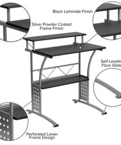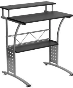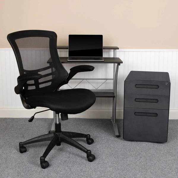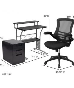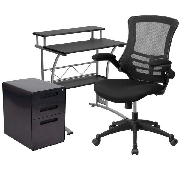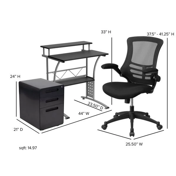 Who says compact office suites can't be functional? Add a contemporary look to your office with this desk and chair bundle. You'll be able to keep up with your daily demands effectively with the ergonomic mesh back office chair and pedestal storage. Take the stress out of starting your home business with an office in a box set to help you get started. Hand selected for your shopping convenience, this office set includes a desk chair, computer desk and filing cabinet. The modern computer desk has a raised shelf for your monitor while the main surface holds your keyboard and mouse or laptop. The ergonomic mesh office chair will make your workday more enjoyable with its curved backrest, padded waterfall seat and flip-up arms. The arms flip out of your way when you want to roll your chair underneath the desk and not have to adjust the seat height. Control the force needed to rock or recline with the tension control knob located underneath the seat. Reduce the clutter on your desk by filing away documents inside the 3-drawer filing cabinet. The hanging file drawer holds A4, letter, legal and F4 hanging folders. Two small utility drawers hold your small office accessories while the removable pencil tray organizes your writing utensils, staples and paper clips. Get your workplace office bundle set today and be on your way to running a successful business or working from home.