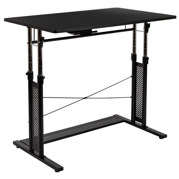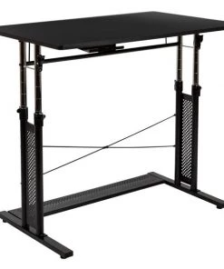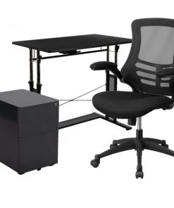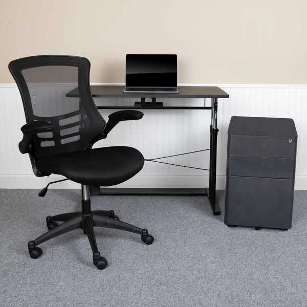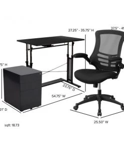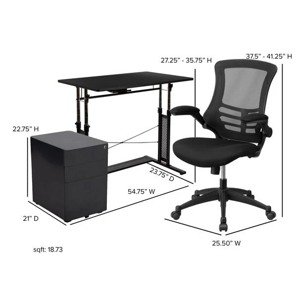 You'll feel like a boss after furnishing your home office with this 3 piece office suite. Hand selected for your shopping convenience, this office set includes a desk chair, computer desk and filing cabinet. The ergonomic office table adjusts from 27.25"-35.75"H to pair with a standard office chair or drafting chair. Make bold moves on this sleek looking adjustable desk that works just like your standard height desk with the added capability to adjust to your preferred working height. Unlock the clamps and push in lever to raise the frame, then snap the clamps back into place for a sturdy worksurface. The ergonomic mesh office chair will make your workday more enjoyable with its curved backrest, padded waterfall seat and flip-up arms. The arms flip out of your way when you want to roll your chair underneath the desk and not have to adjust the seat height. Control the force needed to rock or recline with the tension control knob located underneath the seat. Reduce the clutter on your desk by filing away documents inside the 3-drawer filing cabinet. The hanging file drawer holds A4, letter, legal and F4 hanging folders. Two small utility drawers hold your small office accessories while the removable pencil tray organizes your writing utensils, staples and paper clips. Get your workplace office bundle set today and be on your way to running a successful business or working from home.