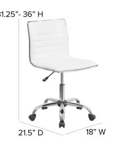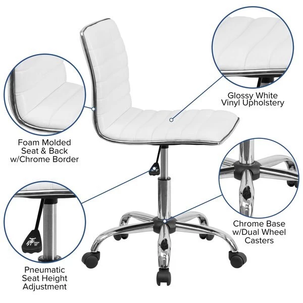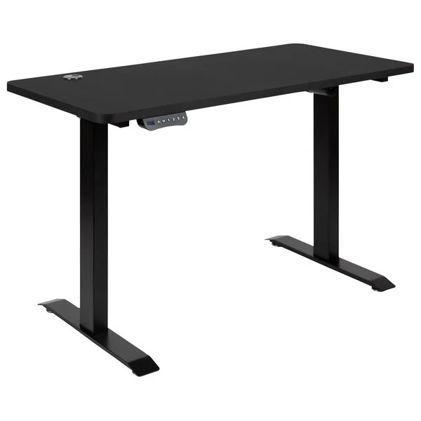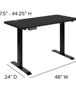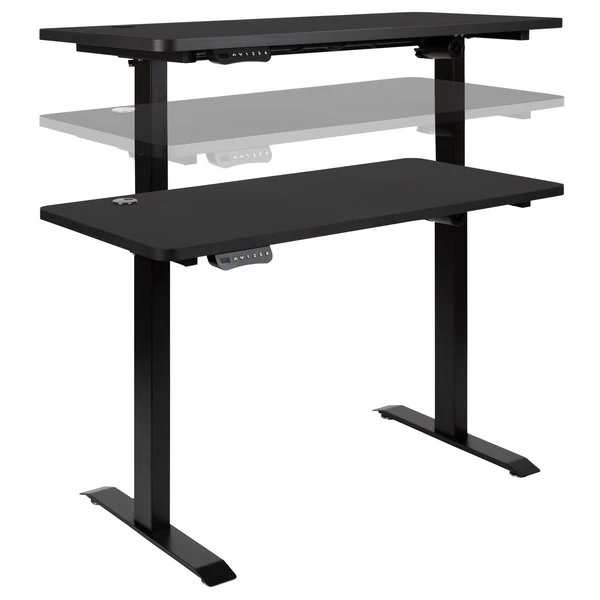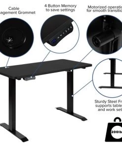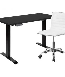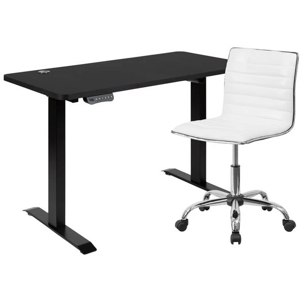 Rejuvenate your work area whether it's downtown or in your basement with this white vinyl upholstered designer task chair and motorized height adjustable standing desk. A great environment can lift your mood so the elegant design of this desk and chair combo will make it a lot nicer to go to work. The modern look of this low-back 360 degree swivel task chair can be used in any decor, not just in the office. The pneumatic seat height adjustment lever lets you easily position the chair where you need it while the lack of arms allows you to roll further under your desk to get closer to your monitor or paperwork without leaning forward. The sleek 5-star chrome base with dual wheel casters holds up to 250 pounds. Rounding out this standing desk and chair set is the sophisticated look of this black motorized adjustable height desk. Enjoy up to 4 custom settings with the push of a button or use the up and down touch pads for manual adjustment. This adjustable sit to stand desk can be used with regular office chairs or drafting chairs. The smooth and quiet motion of the motor mechanism won't upset your morning coffee or annoy coworkers. A built-in grommet for cable management keeps cords orderly and out of the way. This electric standing desk boasts a spacious worksurface that accommodates dual monitors and supports up to 200 lbs. static weight capacity. This adjustable sit to stand desk with push button memory paired with the designer office chair presents a well rounded design to get you through your workday.
