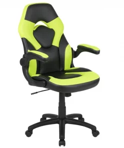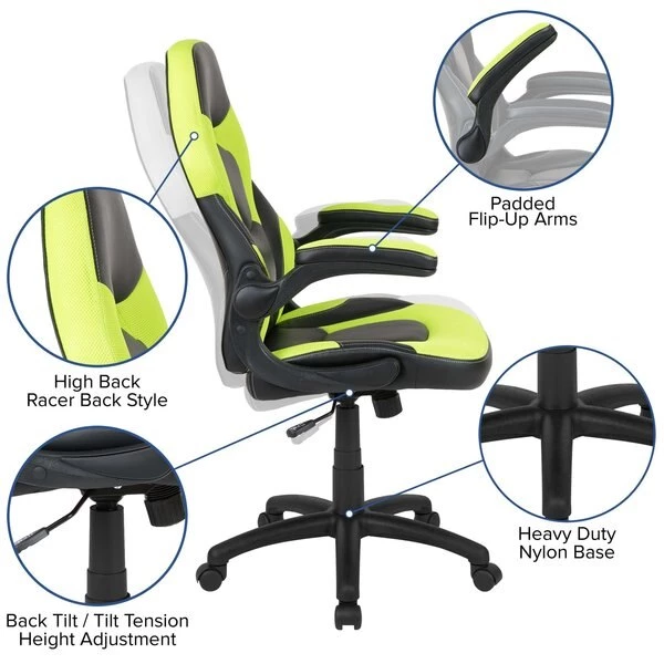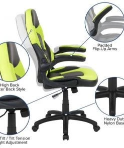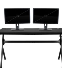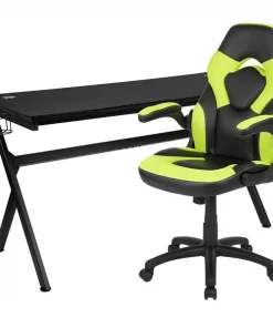 Let the games begin on this gaming desk and chair set. The extra large black top gamers table has 2 grommets for cable management, removable mouse pad top, a detachable cup holder and headset holder to keep you in game mode. The racing game chair have flip-up arms to comfortably rest your arms on while handling the controller or flip-up to slide under the desk. Be true to the gaming experience with a desk and chair combo designed for gaming systems. This PC gaming desk has ample space for dual monitors. Use the cup holder to prevent beverages from spilling on your pc gaming keyboard. The comfortably padded ergonomic gaming chair has a full swivel cylinder and adjusts with the pneumatic lever. Tilt back with ease by pulling the lever outward, control the force needed to recline by turning the knob underneath the seat. Made for gamers, this gaming desk and chair bundle will get you on your way to leveling up.