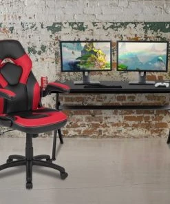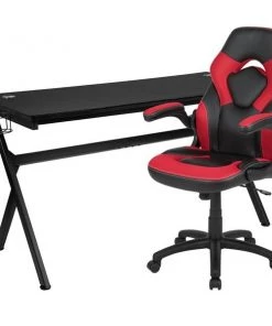 Let the games begin on this gaming desk and chair set. The extra large black top gamers table has 2 grommets for cable management, removable mouse pad top, a detachable cup holder and headset holder to keep you in game mode. The racing game chair have flip-up arms to comfortably rest your arms on while handling the controller or flip-up to slide under the desk. Be true to the gaming experience with a desk and chair combo designed for gaming systems. This PC gaming desk has ample space for dual monitors. Use the cup holder to prevent beverages from spilling on your pc gaming keyboard. The comfortably padded ergonomic gaming chair has a full swivel cylinder and adjusts with the pneumatic lever. Tilt back with ease by pulling the lever outward, control the force needed to recline by turning the knob underneath the seat. Made for gamers, this gaming desk and chair bundle will get you on your way to leveling up.