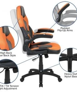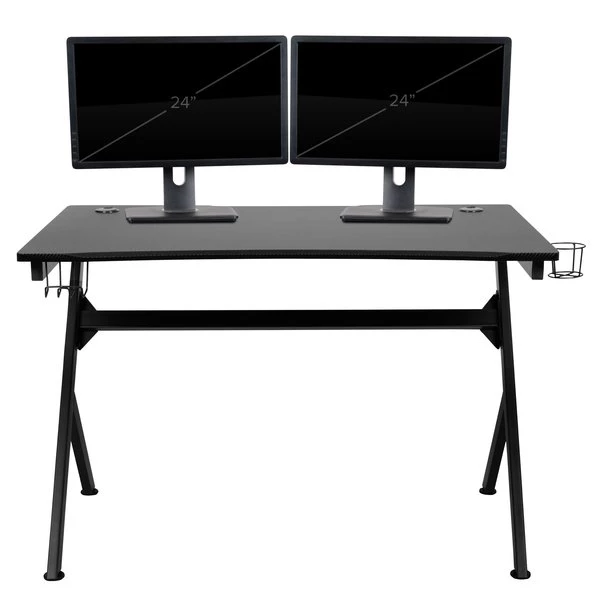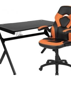 Let the games begin on this gaming desk and chair set. The black top gamers table has 2 grommets for cable management, a detachable cup holder and headset holder to keep you in game mode. The racing game chair have flip-up arms to comfortably rest your arms on while handling the controller or flip-up to slide under the desk. Be true to the gaming experience with a desk and chair combo designed for gaming systems. This PC gaming desk has a spacious, lightweight carbon fiber top that lends superior strength and prevents rust and corrosion while the low thermal expansion properties preserve fiber integrity to extend the lifetime of the desktop. Use the cup holder to prevent beverages from spilling on your pc gaming keyboard. The comfortably padded ergonomic gaming chair has a full swivel cylinder and adjusts with the pneumatic lever. Tilt back with ease by pulling the lever outward, control the force needed to recline by turning the knob underneath the seat. Made for gamers, this gaming desk and chair bundle will get you on your way to leveling up.