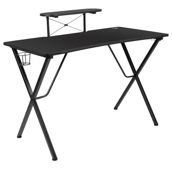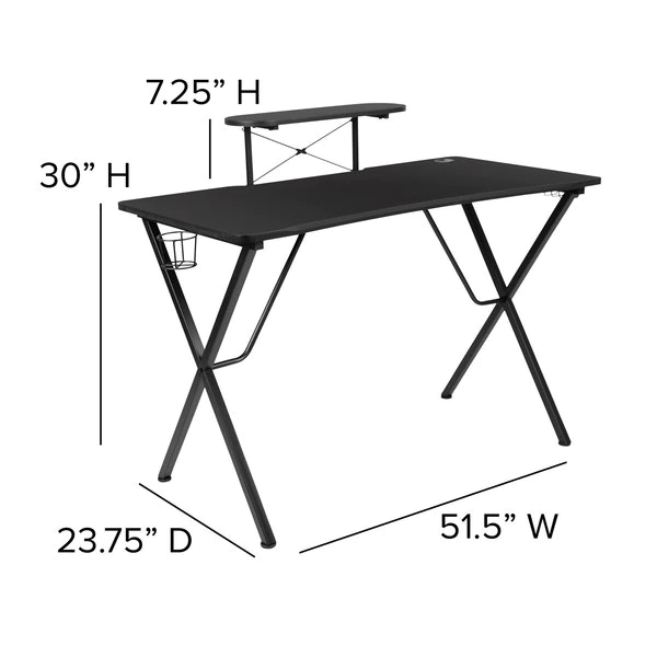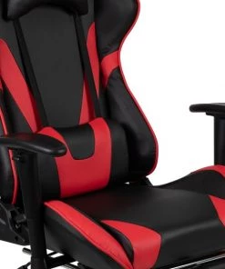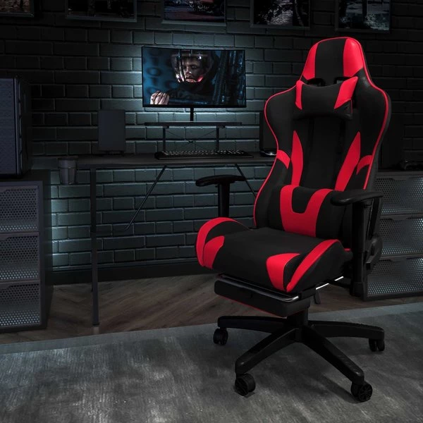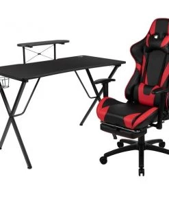 You're going to enjoy playing on this high-performance racing gaming chair with slide-out footrest. This modern gaming chair is paired with an ergonomic gaming desk that has a raised platform to reduce neck strain. If you sit for hours in an office chair you need a gaming chair that is comfortable, and this chair includes adjustable and removable headrest and lumbar pillows. For maximum support this office chair with footrest engages by pulling the loop then flipping the footrest up to elevate your feet and has a separate lever to recline the back 87° ~ 145°. Upgrade your gaming furniture with this desk and chair bundle that offers the perfect combination at an unbeatable price. The black top gamers table can hold up to two monitors and has two grommets for cable management. Always know where your headset is with the included headrest hook while you keep your desktop and pc gaming keyboard clear of accidental spills by placing hot and cold beverages in the cup holder. Your online followers will know that you're serious when they see you in your reclining gaming chair with footrest.