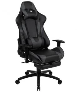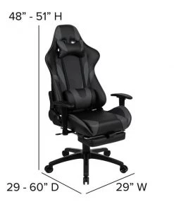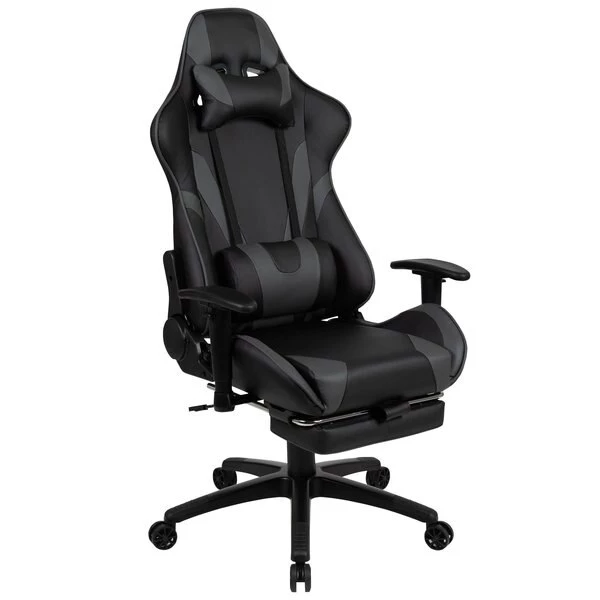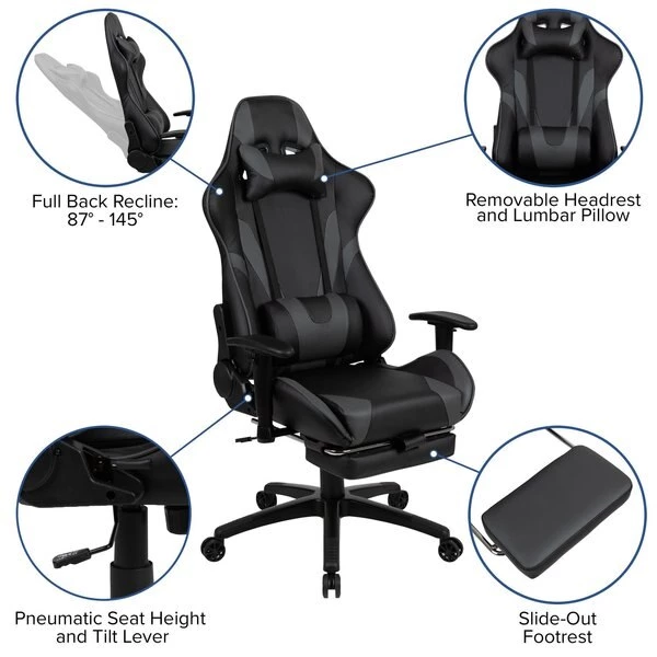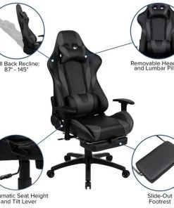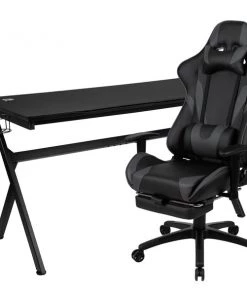 You're going to enjoy playing on this high-performance racing gaming chair with slide-out footrest. This modern gaming chair is paired with an ergonomic gaming desk. If you sit for hours in an office chair you need a gaming chair that is comfortable, and this chair includes adjustable and removable headrest and lumbar pillows. For maximum support this office chair with footrest engages by pulling the loop then flipping the footrest up to elevate your feet and has a separate lever to recline the back 87° ~ 145°. Upgrade your gaming furniture with this extra large desk and chair bundle that offers the perfect combination at an unbeatable price. The black top gamers table features a removable mouse pad top, can hold up to two monitors and has two grommets for cable management. Always know where your headset is with the included headrest hook while you keep your desktop and pc gaming keyboard clear of accidental spills by placing hot and cold beverages in the cup holder. Your online followers will know that you're serious when they see you in your reclining gaming chair with footrest.