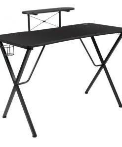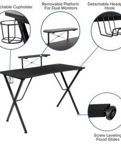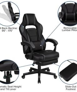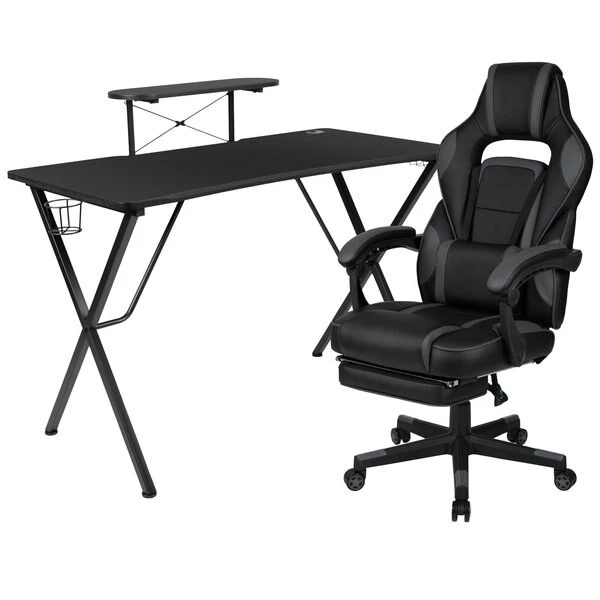 You're going to enjoy playing on this high-performance racing gaming chair with massaging lumbar and slide-out footrest. This modern gaming chair is paired with an ergonomic gaming desk that has a raised platform to reduce neck strain. with an adjustable and removable headrest pillow and massaging lumbar pillow. For maximum support this office chair with footrest engages by pulling the loop then flipping the footrest up to elevate your feet and has a separate lever to recline the back 87° ~ 145°. Plug in the 3 foot USB cord to get a relaxing massage from the lumbar pillow. The black top gamers table can hold up to two monitors and has two grommets for cable management. Always know where your headset is with the included headrest hook while you keep your desktop and pc gaming keyboard clear of accidental spills by placing hot and cold beverages in the cup holder. Your online followers will know that you're serious when they see you in your reclining gaming chair with footrest.