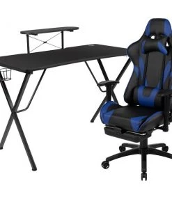 You're going to enjoy playing on this high-performance racing gaming chair with slide-out footrest. This modern gaming chair is paired with an ergonomic gaming desk that has a raised platform to reduce neck strain. If you sit for hours in an office chair you need a gaming chair that is comfortable, and this chair includes adjustable and removable headrest and lumbar pillows. For maximum support this office chair with footrest engages by pulling the loop then flipping the footrest up to elevate your feet and has a separate lever to recline the back 87° ~ 145°. Upgrade your gaming furniture with this desk and chair bundle that offers the perfect combination at an unbeatable price. The black top gamers table can hold up to two monitors and has two grommets for cable management. Always know where your headset is with the included headrest hook while you keep your desktop and pc gaming keyboard clear of accidental spills by placing hot and cold beverages in the cup holder. Your online followers will know that you're serious when they see you in your reclining gaming chair with footrest.