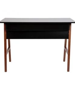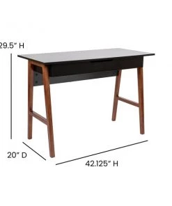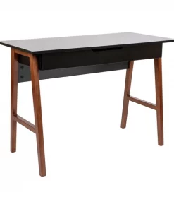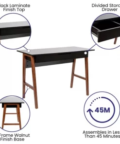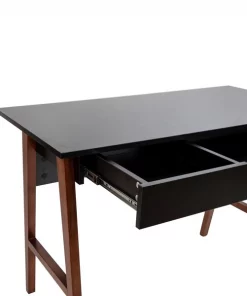 If you're now working from home, a full time student, or an aspiring writer it's important to have a space you enjoy spending time in. Create a comfortable and stylish place to spend your working or creative hours with this two-tone writing computer desk with storage drawer. The smooth rectangular laminate top provides ample room for your desktop or laptop computer and boasts a black finish that pairs beautifully with the walnut A-frame legs. This home office desk features a partitioned drawer to hold important papers on one side and office accessories on the other. Ball bearing drawer slides allow whisper-quiet opening and closing. Quality construction and superior materials make up this wood writing desk. The strong and durable frame is made from rubberwood that is part of the maple family and is capable of holding up to 200 pounds static weight capacity. The laminate top protects against chips and scratches and is easily cleaned with a water based cleaner. This versatile desk will make a lovely vanity desk as an influencer with plenty of room to display items on the expansive top and store cosmetics in the divided storage drawer. The integrated floor glides protect floor surfaces when you need a change of scenery in another room. With a medium assembly level, you can have your new desk up and ready to decorate in under 45 minutes. Place this writing desk with drawer in your home office, dorm room or in your small apartment for a one-of-a-kind workspace that will look great for years to come.