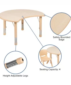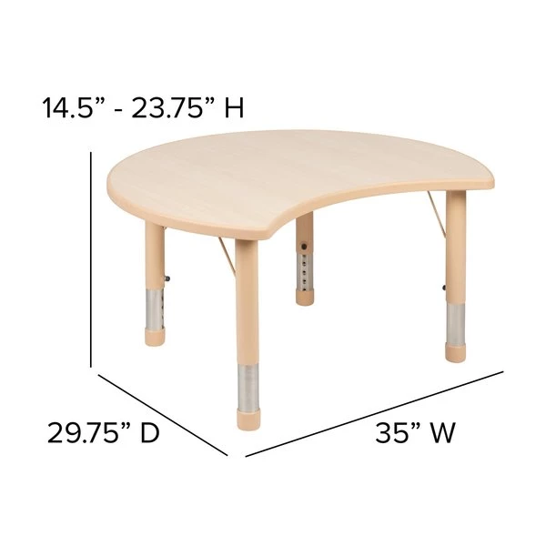 Interaction with other kids is essential for developing tots and a crescent activity table allows for this interaction to happen effortlessly. Perfect as a classroom table, the safety rounded corners reduce injury around rambunctious toddlers. The laminate top and plastic edge material blend seamlessly. The neutral tone focuses children on learning assignments. Adjustable height legs give you the flexibility to raise or lower to accommodate kids up to the age of 7. Children appreciate having their own area within the common areas of the home. This activity table serves as a play table or kids dining table. Host play dates while accommodating 4 children around this round plastic table. Don't let spills ruin the fun, the low maintenance top is easy to clean. Boasting a neutral finish this play table is suitable for girls and boys. This plastic table is heavy-duty for use in preschools, daycares and playrooms. Pair with our natural plastic stackable school chairs for a complete table and chair ensemble.