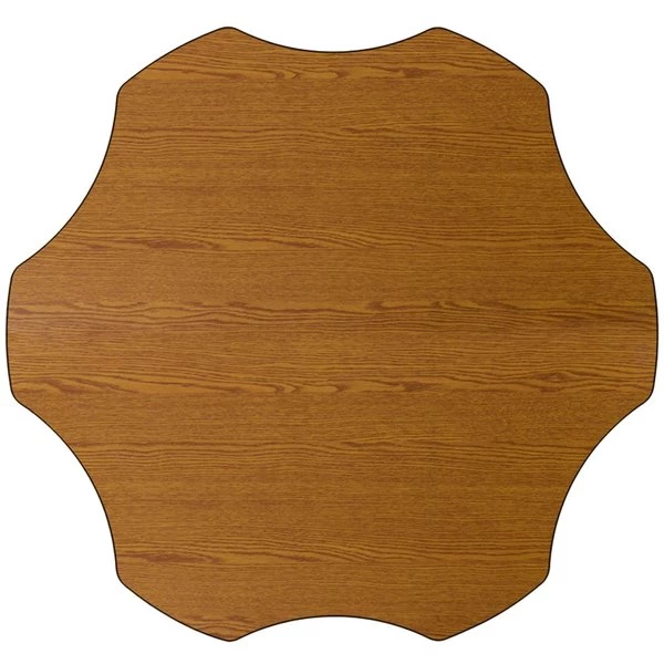 The Flower Activity Table is a versatile option for school classrooms, corporate training centers and your home. Enhance collaborative learning by grouping tables together. It will accommodate children of all ages, from 1st grade to adult.It features a 60'' thermal fused scratch, stain and warp resistant laminate top with a black edge band and 16 gauge tubular steel legs for increased stability. The top incorporates a protective underside backing sheet to prevent moisture absorption and warping. An attractive black powder coated finish protects the upper legs from scratches and height adjustable chrome lower legs give you the flexibility to raise or lower the table a full 9 inches in 1 inch increments. Self-leveling nylon floor glides keep the table from wobbling and protect your floor by sliding smoothly when you need to move it.This activity table provides a durable work surface for anything from computer labs to project meetings to laying out fabric in your sewing room. <ul><li>Flower Shaped Activity Table</li><li>Shape encourages creative interaction</li><li>Scratch and Stain Resistant Surface</li><li>1.125'' Thick Thermal Fused Oak Laminate Top</li><li>Black Edge Band</li><li>16 Gauge Tubular Steel Legs</li><li>Black Powder Coated Upper Legs and Chrome Lower Legs</li><li>Legs Adjust in 1'' Increments</li><li>Self-Leveling Nylon Floor Glides</li><li>Recommended Grade Level: 1st Grade – Adult</li></ul>
