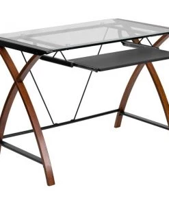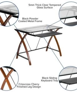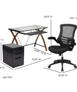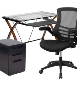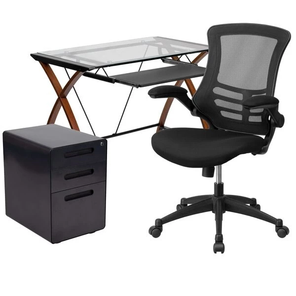 If you're looking to revive your home office a glass computer desk will bring your office up-to-date. This desk and chair set with filing cabinet is a great start for your new business venture. Having pleasant office seating and storage is essential for keeping up with daily tasks and this office in a box set provides you with plenty of resources. Hand selected for your shopping convenience, this office set includes a desk chair, computer desk and filing cabinet. The modern computer desk has cherry finished crisscross legs and the glass is protected by metal sides that prevent any accidents. The pullout keyboard tray offers a dedicated space for your mouse and keyboard or tablet when using a laptop. The ergonomic mesh office chair will make your workday more enjoyable with its curved backrest, padded waterfall seat and flip-up arms. The arms flip out of your way when you want to roll your chair underneath the desk and not have to adjust the seat height. Control the force needed to rock or recline with the tension control knob located underneath the seat. Reduce the clutter on your desk by filing away documents inside the 3-drawer filing cabinet. The hanging file drawer holds A4, letter, legal and F4 hanging folders. Two small utility drawers hold your small office accessories while the removable pencil tray organizes your writing utensils, staples and paper clips. Get your workplace office bundle set today and be on your way to running a successful business or working from home.