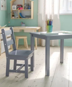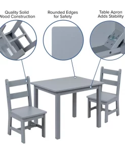 In a world where everything is always too big or too tall, life can be frustrating for your little ones so give them a space that is uniquely theirs where their feet will actually touch the floor. This gray finish, solid wood table and 2 chairs set is the perfect place for a child's creative endeavors, a safe place for clay and markers and the perfect spot for snacks or dinner time. Having their own table and chairs teaches practical skills like wiping the table after meals and encourages independence so they can do things for themselves. When you are looking for seating that will hold those most precious to you, quality construction is key. mortise and tenon construction has been used for years by master craftsmen and is one of the strongest, most stable joints especially for right angles. Metal screws serve as reinforcements giving this kids wood table and chair set exceptional strength and durability. Recommended for ages 5-7, this wood table and 2 chairs set will hold up to 170 lbs. Rounded edges help keep children safe from sharp corners. We know you want to spend quality time with your children not putting things together so this set assembles in under an hour with the included tools. Easily clean up messes with water and follow with a dry cloth to keep this wooden kids table and chairs set looking new. The space saving design of this set allows it to be used in the living room, dining room, play room, kitchen or bedroom.