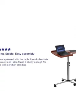 Laptop Desk, Stand Up, Material Laminate/Metal/Plastic, Number of Shelves (1) Adjustable Shelf, Color Cherry, Overall Height (In.) 28-1/2 to 38-1/2, Overall Width (In.) 29 1/4 in, Overall Depth (In.) 17 1/2 in, Server Shelf Depth (In.) 15 3/4 in, Server Shelf Width (In.) 11 13/16 in, Keyboard Shelf No, Construction Laminate, Finish Laminate, Adjustable Yes, Number of Casters 4, Caster Type (2) Locking, (2) Swivel, Caster Lock Yes, Assembly Required, Standards ANSI/BIFMA
