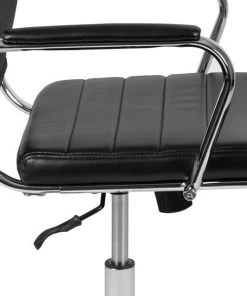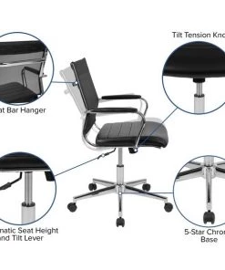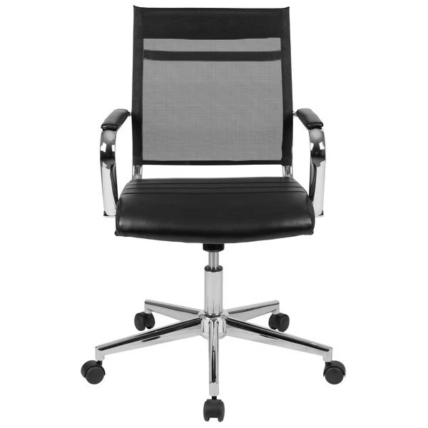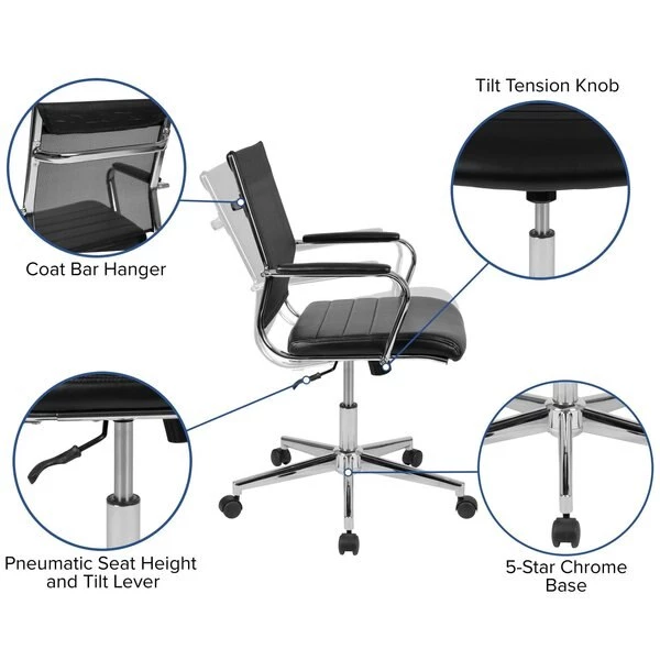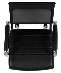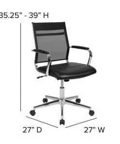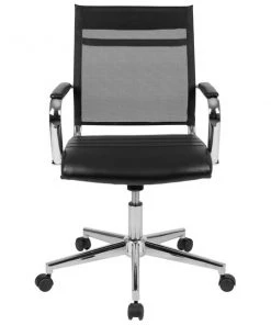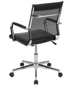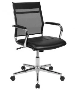 Breathe new life into your office space with mesh office chairs, whether it be your home office, satellite office or main office suite. With an executive appearance, the LeatherSoft seat is not only easy on the eyes but offers robust structure with a ribbed design. Impressive chrome arms with a padded layer provide support to your upper body while looking exquisite. Deliver successful meetings and presentations as guests sit comfortably on these mid-back mesh conference chairs. Have visitors drape their suit jacket over the coat hanger bar to prevent from falling when getting in and out the chair during breaks. The chair offers effortless adjustments, modify the seat height by utilizing the lever underneath the seat that also locks the chair in an upright position. When you want to lean back pull the lever out and use the knob to adjust the force that'll be required to recline. Don't allow the stresses of the day get to you, keep yourself tranquil with a mesh back office chair. The mesh material allow air to effectively circulate to your back.