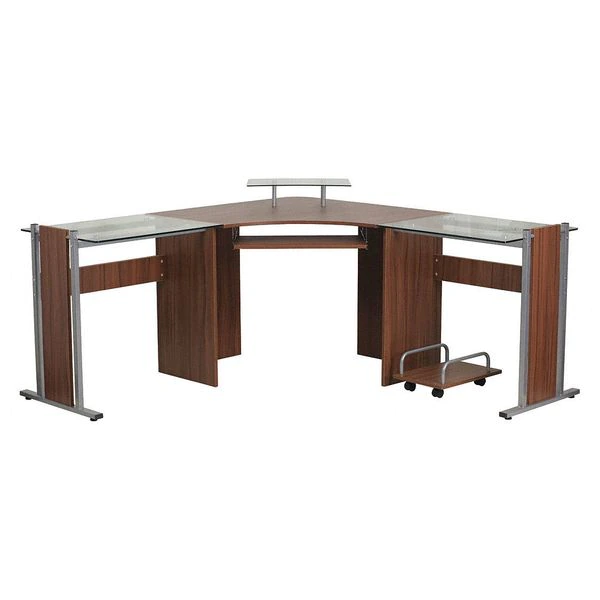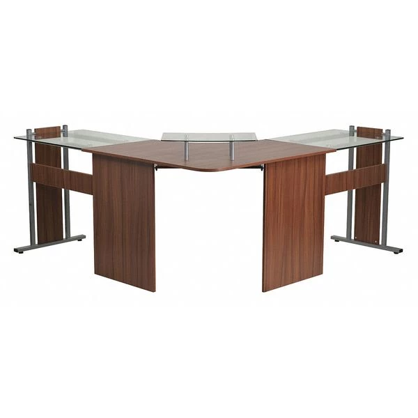 Office Desk, Overall Width 95 in, Overall Height 34 in, Overall Depth 61 3/4 in, Number of Pedestals 0, Pedestal Location None, Number of Drawers 0, Pedestal Style None, Keyboard Shelf No, Color Base Silver, Color Top Teakwood, Base Material Metal, Top Material Glass, No Handle, Assembly Required, Standards ANSI/BIFMA