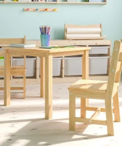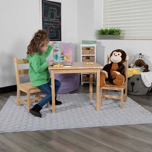 In a world where everything is always too big or too tall, life can be frustrating for your little ones so give them a space that is uniquely theirs where their feet will actually touch the floor. This natural finish, solid wood table and 2 chairs set is the perfect place for a child's creative endeavors, a safe place for clay and markers and the perfect spot for snacks or dinner time. Having their own table and chairs teaches practical skills like wiping the table after meals and encourages independence so they can do things for themselves. When you are looking for seating that will hold those most precious to you, quality construction is key. mortise and tenon construction has been used for years by master craftsmen and is one of the strongest, most stable joints especially for right angles. Metal screws serve as reinforcements giving this kids wood table and chair set exceptional strength and durability. Recommended for ages 5-7, this wood table and 2 chairs set will hold up to 170 lbs. Rounded edges help keep children safe from sharp corners. We know you want to spend quality time with your children not putting things together so this set assembles in under an hour with the included tools. Easily clean up messes with water and follow with a dry cloth to keep this wooden kids table and chairs set looking new. The space saving design of this set allows it to be used in the living room, dining room, play room, kitchen or bedroom.