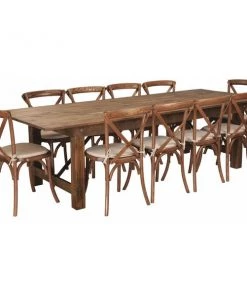 Dine in style with this farm house style table set. The table features a plank style top and foldable legs. Pins pull out to fold the legs that securely lock underneath the table. The same pins provide extra stability when the table is in use. The stackable cross back chair features ash wood, 1'' thick natural cushion, and protective floor glides. Whether you're going for a country feel or a modern appeal, this set will get you the desired results. <ul><li>Farm Table and Chair Set</li><li>Rustic Style</li><li>Seats 10 Adults</li><li>Designed for Commercial and Residential Use</li><li>Wood Folding Table</li><li>Plank Top</li><li>Legs Lock underneath top</li><li>Push In Pins to secure legs</li><li>Pull Out Pins to fold legs</li><li>Solid Pine Construction</li></ul>