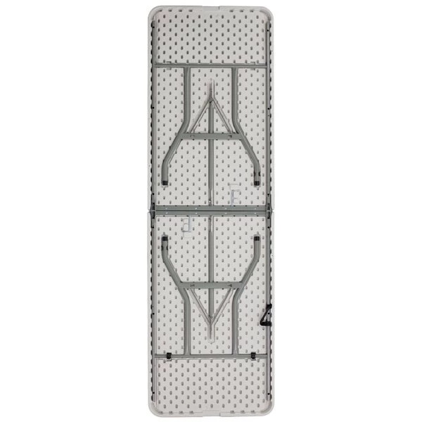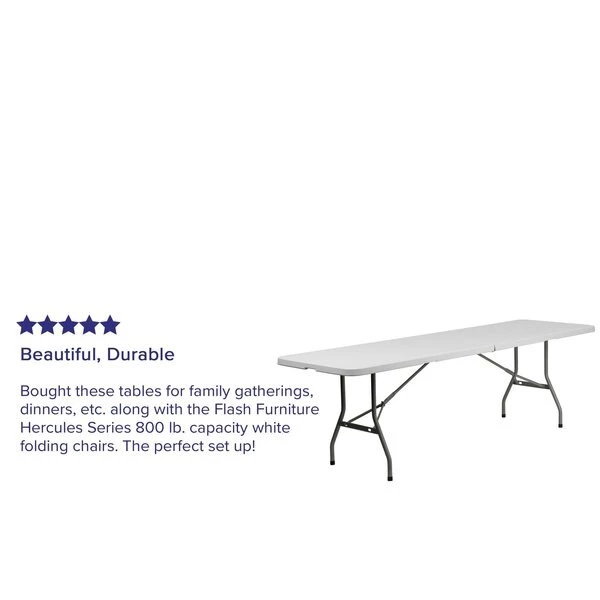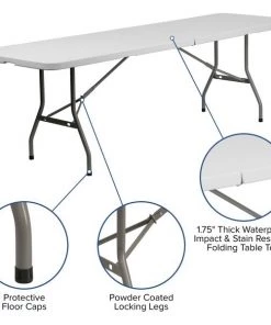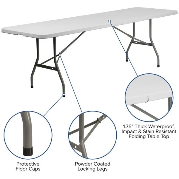If you attend trade shows and have catalogs and products to display this portable folding table with carrying handle will make your life a little easier. Have your table standout at expos by draping a floor length table cover over the table and offering sweets to engage people as they walk by. After events the legs lock into place underneath the top and folds in half to transport with less effort. Be unbothered when your relatives invite additional friends to the barbecue, you'll have plenty of space on this 8' long centerfold table. This event folding table accommodates up to 10 adults to throw big birthday parties and host baby showers. This ready to use table is commercial grade and is often used in restaurants, warehouses, schools, churches and recreation centers. Event rental venues keep rectangle folding tables on the premises as they are the most used to accommodate parties of all sizes. Rectangular tables can be arranged to create a u-shape to allow space for a dance floor. Easy to clean and store, plastic folding tables are the best and most popular option for any occasion. Although designed for indoor events this party table can be used outdoors on the deck or patio during good weather. Store the table indoors and protect the frame from extreme moisture. Invite everyone to the celebration when you have this 30×96 plastic folding table readily available at your home or business.