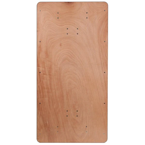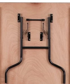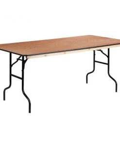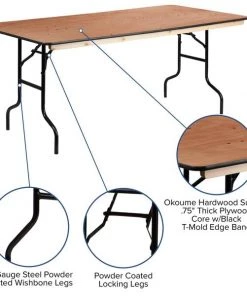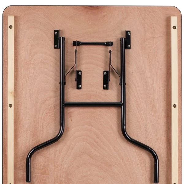 If you want a table that is sturdy, long-lasting and versatile enough to use anywhere this heavy duty folding table is as good as it gets! The Rectangular Wood Folding Banquet Table is a commercial grade table that can be used as a training table, trade show booth, or a banquet table. Featuring an Okoume hardwood surface, this table is 6 feet long, 3 feet wide and .75 inches thick, with a blackedge band. It has a 580 pound static load capacity and will seat up to 8 adults. Its durable, easy to clean tabletop is sealed with a quadruple coated polyurethane varnish. The underside of the table is finished with a double coated polyurethane varnish. Two heavy duty, wood runners, secured to the underside of the table, increase load capacity and allow for more secure stacking, transport and storage. The heavy duty wishbone legs lock securely in place when the table is in use. A black powder coating protects the legs from scratches, and non-marring floor caps protect your floor. This is a particularly good choice for party rental companies and other organizations that hold many events throughout the year.