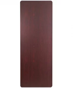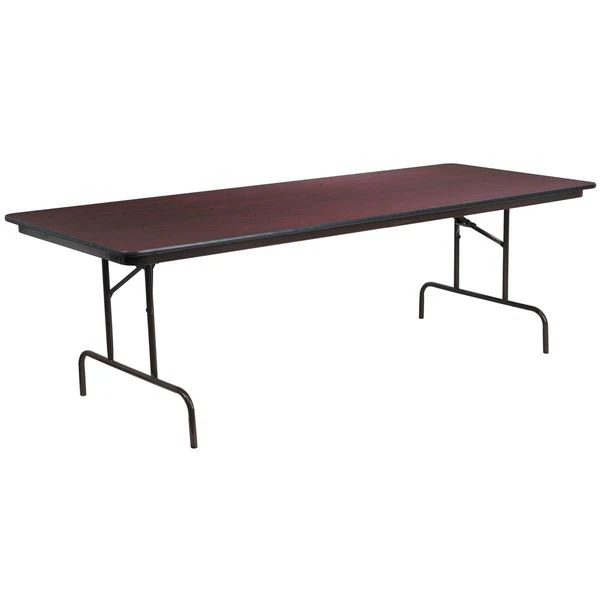 This rectangular wood folding table is beneficial in a multitude of settings that include banquet halls, banquet facilities, cafeterias, schools and in the home. The table can be used as a temporary seating solution or be setup for everyday use. The table legs fold under the table to make storage more convenient and for better portability. This table is commercial grade to withstand everyday use in the hospitality industry. <ul><li>Ready To Use Banquet Table</li><li>8' Folding Table</li><li>Seats up to 10 Adults</li><li>.75'' Thick Melamine Laminate Mahogany Top</li><li>Brown T-Mold Edge Band</li><li>Brown Powder Coated Pedestal Legs</li><li>18 Gauge Steel Legs</li><li>Protective Floor Caps</li><li>Designed for Commercial Use</li></ul>