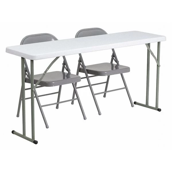 This folding table set will get you started with furnishing your training room. Creating an inviting and comfortable arrangement for your trainees and guests can help you meet your goals for success. This set includes a durable stain resistant plastic folding table and complementary chairs. This setup can be used as a permanent arrangement or easily be stored away for occasional usage. So take the guess work out of piecing together a table set with this 3 piece table setup. <ul><li>Training Table Set</li><li>Set Includes: Rectangular Table and 2 Metal Folding Chairs</li><li>Ships Fully Assembled</li><li>Designed for Commercial Use</li><li>Folding Table</li><li>330 lb. Static Load Capacity</li><li>1.75'' Thick Granite White Table Top</li><li>Waterproof, Impact and Stain Resistant Top</li><li>Gray Powder Coated Locking Legs</li><li>Protective Floor Caps</li></ul>