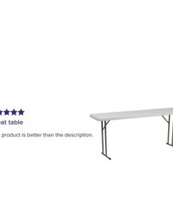 Fill that new designated training room with this narrow rectangular plastic folding table. The space saving design can fit multiple tables in small and large rooms making it the perfect training style table for any classroom or training facility. Have people pick up test packets and informational pamphlets on this perfectly sized folding table. Cleanup is simple on this durable, waterproof top to pick up spills quickly. This 70.8 inch folding table seats 3 people on one side of the table allowing all at the table a clear view of the board and instructor. When you want to store or transport the legs lock underneath the top. Folding tables can be your go-to table to setup your products at convention centers.
