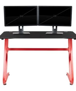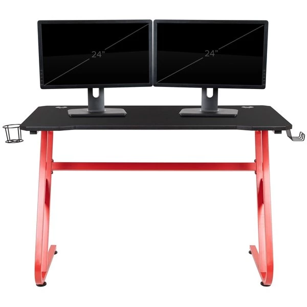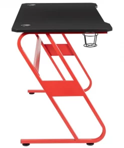 Add personality to your gaming setup with this ergonomic gaming desk with sleek red frame. For excitable players, this game station has a cup holder to prevent accidental spills. For those that game at home or are professional game testers in an office, gaming desks and chairs are essential for daily gamers. The multi-function workstation powers you through game sessions and work demands on a sturdy z-shape frame. Reduce clutter on the worksurface by feeding cords through the two provided grommets. Always know where your headset is by placing on the headset hook in between games. Upgrade the gamer or salesman in your home or office with this computer gaming desk. Complete your gaming setup with our Gaming Chair Racing Office Ergonomic Computer PC Chairs.