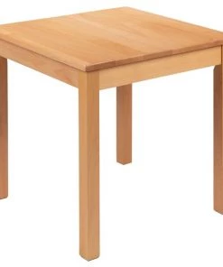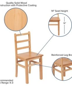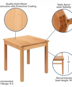 Encourage kids development when they're seated around a wooden classroom table as they trace words, color and create. This 3-piece wood table set includes a square table and two wooden chairs. The 2 pack kids chairs have a 14" seat height and glides to reduce noise, scratches and carpet snags. For safety, the wood table and chairs are coated in a protective finish to prevent splintering. Wood furniture in the classroom brings nostalgia to simpler times and are ideal in school libraries, daycares, preschools and K-3 classrooms. The natural wood finished table set is designed to keep young pupils focused on the teacher and their work assignments without the distraction of bold colors. Not just for the classroom but this kid sized table set will be of excellent use in the home as an activity table, dining table and a common place to complete schoolwork.
