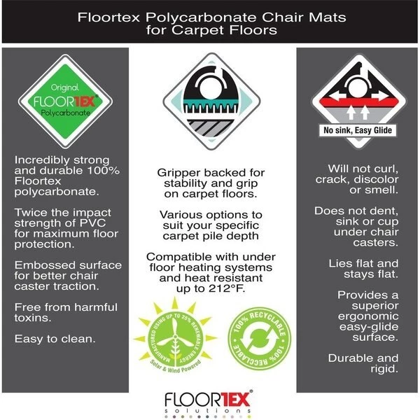 Cleartex Ultimat Chairmat is manufactured from Original Floortex Polycarbonate for the ultimate in durability. It has twice the impact strength of PVC to provide a highly rigid, ergonomic, easy-glide surface. High clarity allows the beauty of flooring to shine through. Contoured chairmat protects flooring from wear and damage caused by chair casters. Gripper back is ideal for use on low to medium-pile carpets up to 1/2" thick. Polycarbonate will instantly go flat so no need to wait to flatten before use. Manufactured using up to 30 percent renewable energy, this 100 percent recyclable chairmat is free of phthalates, cadmium, tin and lead content. It is also Green Guard Indoor Air Quality Certified.