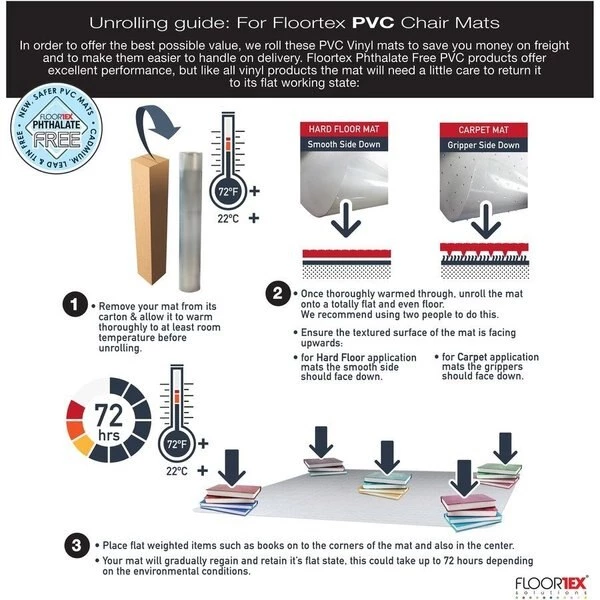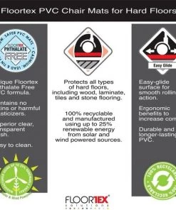 Floortex Phthalate-Free Advantagemat provides long-lasting floor protection for the home and office, especially from carpet wear caused by chair casters. It is suitable for a wide range of uses. Unique Floortex Formulation provides a clear and durable PVC mat that is free from the phthalate plasticizers that have been banned from children's toys and medical instruments, making this PVC mat even safer to use. It is also free of tin, lead, cadmium and chemical content banned from child-related products. Ergonomic design allows easy-glide movement and reduced leg fatigue. Smooth back is suitable for use on hard floors and carpet tiles.