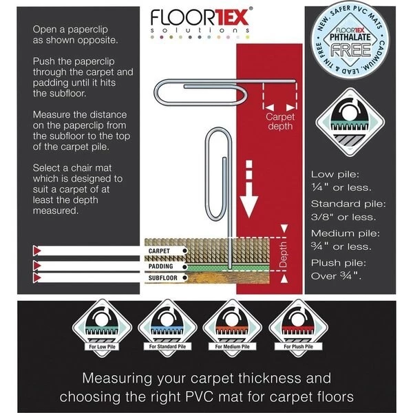 Cleartex Advantagemat Chairmat provides a high-quality and durable solution for floor protection and ergonomics. It protects your carpet surfaces from office chair casters, general wear, scuffs and spills. It will not crack, chip, break or shatter under normal use and correct application. Chairmat is free of phthalates, tin, lead, cadmium and BPA for peace of mind when used around children or pets. Eco-friendly manufacturing uses 25 percent renewable energy and recycled content. Chairmat is 100 percent recyclable.
