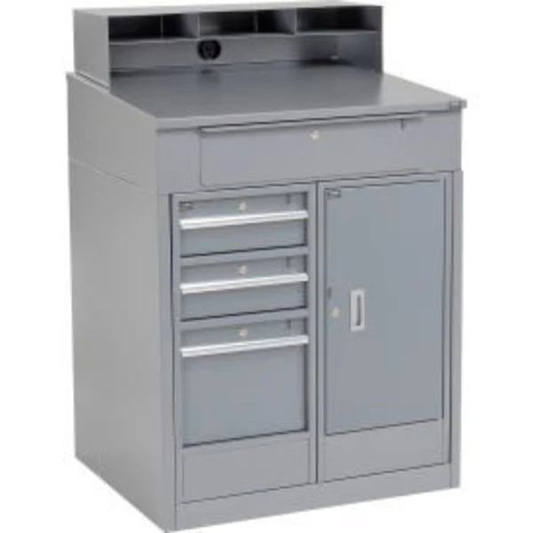 THIS INDUSTRIAL QUALITY SHOP DESK PROVIDES SECURE STORAGE AND ORGANIZATION FOR SHIPPING AREAS OR WORKSHOPS. THE FURNITURE GRADE STEEL CONSTRUCTION IS FINISHED WITH AN ATTRACTIVE, SCRATCH-RESISTANT GRAY POWDER COATING. THE STEEL BALL BEARING GLIDES PERMIT DRAWERS TO PULL OUT SMOOTHLY AND STOP SECURELY. THE DESK INCLUDES ONE 15"W X 20"D X 27"H LOCKING COMPARTMENT AND 13"W X 17-3/4"D LOCKING DRAWERS IN 2 HEIGHTS; 5-1/2"H AND 12"H. THE SLOPED WRITING SURFACE INCLUDES A PIGEONHOLE ORGANIZER WITH TWO 10-3/4"W AND ONE 11-3/4"W X 12"D X 7-3/4"H POCKETS TO HOLD FULL SIZE DOCUMENTS. THE CLOSED BASE KEEPS OUT DUST AND DEBRIS FOR EASY MAINTENANCE.
