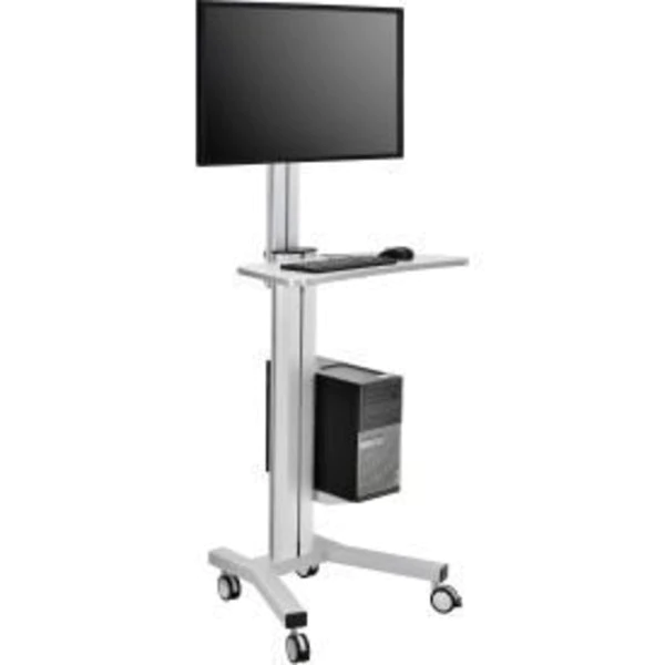 Global ; MOBILE HEIGHT ADJUSTABLE DESKTOP COMPUTER WORKSTATION WITH 4-OUTLET POWER STRIP THIS MOBILE HEIGHT ADJUSTABLE DESKTOP COMPUTER WORKSTATION WITH 4-OUTLET POWER STRIP IS PERFECT FOR OFFICE OR MEDICAL URGENT CARE ENVIRONMENTS. THE WORKSTATION COMES WITH A VESA 75/100 MOUNT WHICH CAN ADJUST FOR TILT, PAN, AS WELL AS MOUNTING HEIGHT. THE 27"W X 14-1/4"D WORKSURFACE IS STURDY AND HEIGHT-ADJUSTABLE AS WELL. THE EXTRUDED ALUMINUM POST IS STRONG AND CORROSION-RESISTANT, AND COME WITH 4 INTEGRATED SWITCHED POWER OUTLETS AND A CPU HOLDER . THE POST CAN HOST A VARIETY OF OPTIONAL ACCESSORIES INCLUDING PRINTER STAND AND STORAGE POCKET. EASY TO MANEUVER WITH FOUR 3" SWIVEL CASTERS (TWO WITH BRAKES). EASY ASSEMBLY. SPECIFICATIONS: <ul> OVERALL DIMENSIONS: 27"W X 19-11/16"D X 69-1/4"H BASE DIMENSIONS: 22"W X 19-11/16"D X 5-3/8"H VESA: 75X75 100X100 FOR UP TO 24" MONITORS (22 LBS. MAX) WORKSURFACE DIMENSIONS: 27"W X 14-1/4"D MAX. CPU WIDTH: 7-1/2"W MAX. CPU WEIGHT: 22 LBS. MAX. WEIGHT CAPACITY: 220 LBS. UNIT WEIGHT: 57 LBS. POWER CORD LENGTH: 4 FEET OPTIONAL ACCESSORIES (SOLD SEPARATELY): <ul> PRINTER SHELF (MODEL# 670066) STORAGE POCKET (MODEL# 670067)</ul></ul>