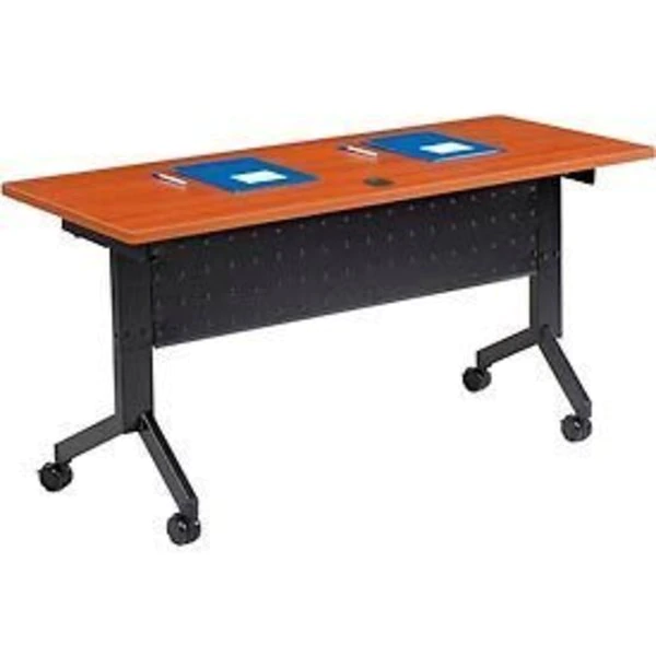 STANDOUT FEATURES: CHECKMARK; FLIPS UP INTO NESTABLE POSITIONS FOR COMPACT STORAGE. CHECKMARK; ROLLS ON WHEEL CASTERS FOR EASY CONFIGURATION. CHECKMARK; COMPLIMENTS ANY WORKSPACE. FURNISH YOUR WORKSPACE WITH THE INTERION ; TRAINING TABLE FLIP-TOP BY Global ;, AN IMPRESSIVE COMPUTER TABLE THAT'S BUILT TO HANDLE A VARIETY OF COMPUTER SETUPS. USE IT TO PLACE SINGLE LAPTOPS OR A COMPLETE COMPUTER SETUP WITH DUAL MONITORS. THE FREESTANDING DESK CAN BE PLACED IN CONFERENCE AREAS, CLASSROOMS, OR COMPUTER LABS. THIS DESK FEATURES A LAMINATE CONSTRUCTION MATERIAL FOR THE TOP, WHICH IS MORE RESISTANT TO SCRATCHES AND SCUFFS THAN STANDARD PAINTED WOOD DESKS. DESK DIMENSIONS: 60"L X 24"W. BUILT-IN GROMMET ALLOWS EASY WIRE MANAGEMENT. ATTRACTIVE CHERRY FINISH. ONE YEAR LIMITED WARRANTY.