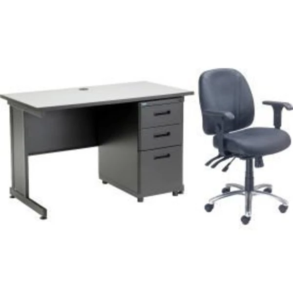FOR ALL OF YOUR HOME OFFICE NEEDS, THIS EASY-TO-ASSEMBLE BUNDLE INCLUDES EVERYTHING YOU NEED TO SET UP AN INSTANT WORKSPACE – ONE DESK, ONE STORAGE PEDESTAL AND A LEATHER CHAIR. DESK COMES WITH A STURDY STEEL FRAME AND A LAMINATE TOP. STEEL PEDESTAL FEATURES 2 DRAWERS AND A FILE CABINET WHICH HOLDS BOTH LETTER AND LEGAL SIZED FILES. MULTIFUNCTION CHAIR INCLUDES ADJUSTABLE HEIGHT ARMS, EXTRA THICK 3-1/2" SEAT CUSHION AND 3 ERGONOMIC CONTROLS – ONE FOR HEIGHT, ONE FOR SEAT TILT AND ONE FOR BACK TILT.