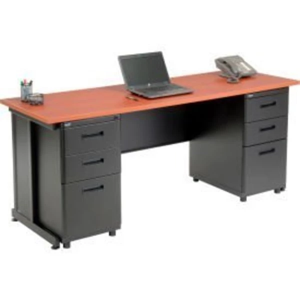 INTERION ; OFFICE DESK WITH BOX/BOX/FILE PEDESTAL 72"W DESK WITH CHERRY TOP INTERION ; BY Global OFFICE DESK FEATURES 1" THICK SCRATCH RESISTANT LAMINATE WORK SURFACES ON A CHARCOAL FINISHED STEEL FRAME. DESKTOP INCLUDES 2-3/16" DIAMETER CABLE MANAGEMENT GROMMET OPENING. DESK INCLUDES MODESTY PANEL AND ADJUSTABLE LEVELING GLIDES. STEEL FILE CABINET FEATURES 2 BOX DRAWERS AND 1 FILE DRAWER THAT ACCEPTS LETTER OR LEGAL SIZE FILING. PEDESTAL INCLUDES GANGED CYLINDER LOCK, RECESSED HANDLES AND ADJUSTABLE LEVELING GLIDES. 1 YEAR LIMITED WARRANTY.