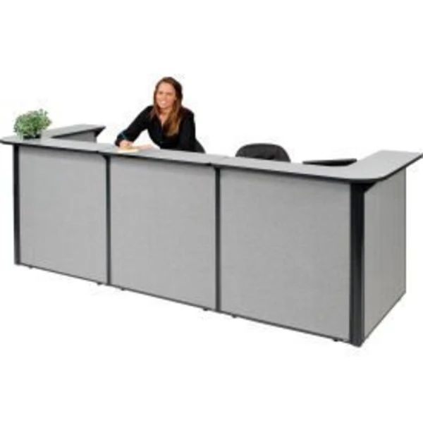 U-SHAPED RECEPTION STATION, 124"W X 44"D X 44"H, GRAY COUNTER, GRAY PANEL INTERION ; BY Global RECEPTION STATIONS ARE BUILT FOR STRENGTH, FUNCTIONALITY AND CONVENIENCE IDEAL FOR RECEPTION ROOMS AND SECURITY AREAS. RECEPTION COUNTERS AND WORK SURFACES ARE MADE USING 1 THICK SCRATCH RESISTANT LAMINATE. 12"D RECEPTION COUNTER PROVIDES A CONVENIENT WRITING SURFACE FOR GUEST AND VISITORS WHILE MAINTAINING PERSONNEL PRIVACY. DESKTOPS INCLUDE 2-3/16" DIAMETER CABLE MANAGEMENT GROMMET OPENING(S). DESK FRAMING IS MADE OF BLACK FINISHED STEEL FOR STRENGTH THAT LASTS. RECEPTION STATION PANELS CONSIST OF INTERION ; PARTITIONS THAT HELP REDUCE NOISE AND CREATE PRIVACY. RECEPTION PANELS ARE FLAME RETARDANT TO MEET THE CALIFORNIA 117 FLAMMABILITY STANDARD. THESE 1-3/4 THICK FABRIC UPHOLSTERED PANELS FEATURE AN INTERIOR ENGINEERED WOOD (MDF) FRAME AND HONEYCOMB CORE COVERED WITH A HEAVY TACKABLE LINER FOR STRUCTURAL STRENGTH AND SUPPORT. PANEL TRIM IS FINISHED WITH SELF-EXTINGUISHING EXTRUDED POLYMER THAT OFFERS OPTIMUM SAFETY AND RIGIDITY. INCLUDES ADJUSTABLE LEVELING FEET THAT ARE IDEAL FOR UNEVEN SURFACES. U-SHAPED RECEPTION STATION INCLUDES A 48"W AND A 60"W DESK. DESKS ACCEPT INSTALLATION OF OPTIONAL STORAGE OPTIONS (SOLD SEPARATELY) INCLUDING PEDESTAL FILE, KEYBOARD DRAWER AND MOUSE TRAY . EASY ASSEMBLY. 1 YEAR LIMITED WARRANTY.