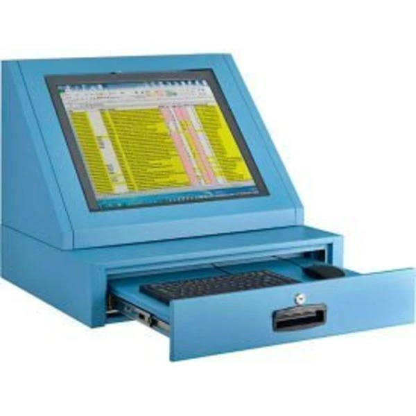 Global ; LCD CONSOLE COUNTER TOP SECURITY COMPUTER CABINET, BLUE LCD CONSOLE COMPUTER CABINET CONVENIENTLY STORES FLAT SCREEN MONITORS AT AN OPTIMUM, ERGONOMIC VIEWING ANGLE FOR INCREASED PRODUCTIVITY. THIS COMPUTER CABINET IS DESIGNED TO KEEP YOUR LCD FLAT SCREEN MONITOR KEYBOARD SAFE WHILE ALLOWING PERSONNEL OR VISITOR USAGE. CONVENIENTLY PLACE THIS CABINET ON ANY DESKTOP OR COUNTERTOP FOR COMPUTER USE. CONVENIENT SLOPED CONSOLE DISPLAY HELPS REDUCE NECK STRAIN FOR COMFORT AND GLARE FOR CLEAR MONITOR VIEWING. INCLUDES 2 TYPES OF MONITOR MOUNTS TO HOLD LCD MONITORS UP TO 19" AND 3-1/2" THICK. INCLUDES A VESA MOUNT MONITOR BRACKET AND ADJUSTABLE CHANNEL FORMED ARMS THAT SUPPORT THE MONITOR FRAME. THE LOCKING MONITOR COMPARTMENT INCLUDES A BREAK-RESISTANT 18-1/2"W X 16-1/2"H ACRYLIC WINDOW FRAMED IN HEAVY-DUTY STEEL. WINDOW PANEL IS REMOVABLE WHICH GIVES EASY ACCESS TO TOUCH SCREEN MONITORS. INCLUDES A 6-1/2" LEDGE THAT ACTS AS AN ADDITIONAL WORK SURFACE. SLIDE-OUT LOCKING KEYBOARD/MOUSE DRAWER IS FULLY EXTENDABLE ON BALL BEARING SLIDES. DRAWER INCLUDES A CYLINDER LOCK FOR SECURITY AND RECESSED DRAWER HANDLE. MONITOR COMPARTMENT IS LOUVERED TO REDUCE HEAT BUILD UP. INCLUDES CONVENIENT CABLE MANAGEMENT PORTS. ALL LOCKS ARE KEYED ALIKE. MEASURES 24-1/2"W X 22-3/8"D X 22-1/4"H OVERALL. EASY ASSEMBLY. 24 GAUGE PANELS, 19 GAUGE SLIDING KEYBOARD/MOUSE TRAY. OPTIONAL AC FAN KIT (MODEL# 249189 SOLD SEPARATELY) REDUCES HEAT BUILD UP. BLUE POWDER COATED FINISH.