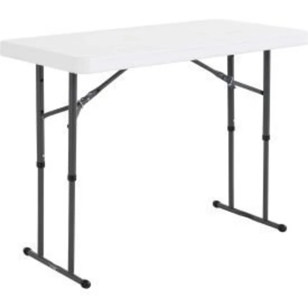 LIFETIME 4-FOOT COMMERCIAL ADJUSTABLE HEIGHT FOLDING TABLES ARE CONSTRUCTED OF HIGH-DENSITY POLYETHYLENE AND HAVE THREE ADJUSTABLE HEIGHT SETTINGS. THEY WILL NOT CRACK, CHIP OR PEEL, AND ARE BUILT FOR INDOOR AND OUTDOOR USE. THE PATENTED STEEL FRAME DESIGN PROVIDES A STURDY FOUNDATION AND IS PROTECTED WITH A POWDER-COATED, WEATHER-RESISTANT FINISH. BACKED BY A TEN-YEAR WARRANTY, LIFETIME'S ADJUSTABLE HEIGHT TABLES ARE PERFECT FOR YOUR HOME, OFFICE, OUTDOOR ACTIVITIES AND MORE LIFETIME 4-FOOT COMMERCIAL ADJUSTABLE FOLDING TABLE – FEATURES A 48 IN. X 24 IN. MOLDED TABLETOP (WHITE GRANITE) WITH A ROUND FOLDING FRAME (GRAY). THIS TABLE HAS THREE ADJUSTABLE HEIGHT SETTINGS (24 IN., 29 IN., AND 36 IN.) AND COMES WITH A 10-YEAR LIMITED WARRANTY. INDIVIDUALLY PACKAGED. FEATURES: <ul> ADJUST THE TABLE USING THE PUSH-PIN ADJUSTMENT ADJUSTS TO 24 IN., 29 IN., AND 36 IN. (61 CM, 74 CM, 91 CM) EXCEEDS ANSI/BIFMA STANDARDS INDOOR/OUTDOOR USE LIGHTWEIGHT DESIGN RUST-RESISTANT POWDER-COATED STEEL FRAME SEATS 4 COMFORTABLY STAIN RESISTANT AND EASY TO CLEAN SUPERIOR STRENGTH AND DURABILITY UV-PROTECTED HIGH-DENSITY POLYETHYLENE (HDPE) TOP LARGER QUANTITY QUOTES AVAILABLE. PLEASE CALL 1-888-978-7759.</ul>