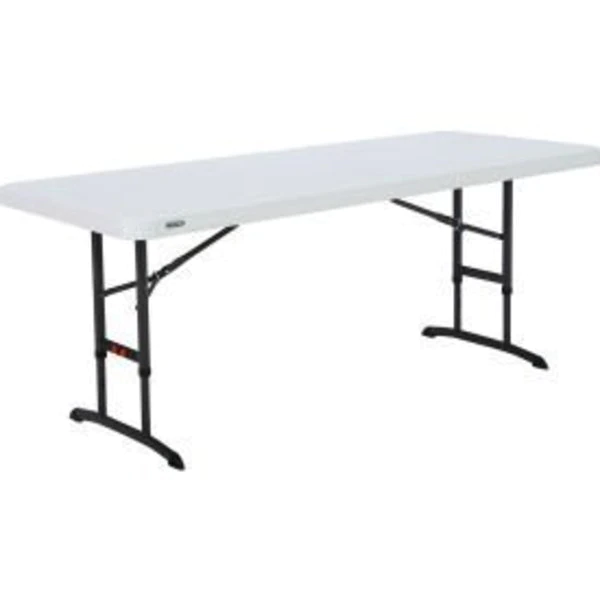 LIFETIME 6-FOOT ADJUSTABLE HEIGHT COMMERCIAL FOLDING TABLES ARE CONSTRUCTED OF HIGH-DENSITY POLYETHYLENE AND HAVE THREE ADJUSTABLE HEIGHT SETTINGS. THEY WILL NOT CRACK, CHIP OR PEEL, AND ARE BUILT FOR INDOOR AND OUTDOOR USE. THE PATENTED STEEL FRAME DESIGN PROVIDES A STURDY FOUNDATION AND IS PROTECTED WITH A POWDER-COATED, WEATHER-RESISTANT FINISH. BACKED BY A TEN-YEAR WARRANTY, LIFETIME'S ADJUSTABLE HEIGHT TABLES ARE PERFECT FOR YOUR HOME, OFFICE, OUTDOOR ACTIVITIES AND MORE LIFETIME 6-FOOT COMMERCIAL ADJUSTABLE HEIGHT FOLDING TABLE – FEATURES A 72 IN. X 30 IN. MOLDED TABLETOP (ALMOND) WITH A ROUND FOLDING FRAME (BRONZE). TABLE HAS THREE ADJUSTABLE HEIGHT SETTINGS AT 24 IN., 29 IN., AND 36 IN. 10-YEAR LIMITED WARRANTY. FEATURES: <ul> THREE ADJUSTABLE HEIGHT SETTINGS ADJUSTS TO 24 IN., 29 IN., AND 36 IN. (61 CM, 74 CM, 91 CM) ADJUSTS TO SEVERAL HEIGHTS WITH JUST ONE HAND EXCEEDS ANSI/BIFMA STANDARDS INDOOR/OUTDOOR USE LIGHTWEIGHT DESIGN RUST-RESISTANT POWDER-COATED STEEL FRAME STAIN RESISTANT AND EASY TO CLEAN SUPERIOR STRENGTH AND DURABILITY THREE ADJUSTABLE HEIGHT SETTINGS UV-PROTECTED HIGH-DENSITY POLYETHYLENE (HDPE) TOP 10-YEAR LIMITED WARRANTY</ul>