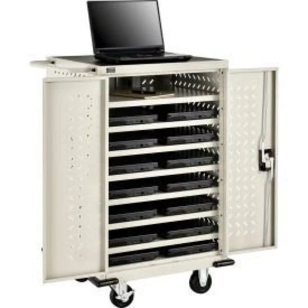 Global ; MOBILE LAPTOP CHROMEBOOK STORAGE CHARGING CART – ASSEMBLED LAPTOP CART STORES, TRANSPORTS AND CHARGES UP TO 12 WIDESCREEN LAPTOP OR CHROMEBOOK ; COMPUTERS AS WELL AS E-READERS, ANDROID TABLETS, IPADS ; AND MORE. FEATURES: <ul> KEEP UP TO 12 LAPTOPS, CHROMEBOOKS OR TABLETS CHARGED AND SECURE IN THIS COMPACT AND VERSATILE CHARGING CART SEVEN SHELVES (23"W X 16"D) CAN HOLD AT LEAST TWO TYPICAL-SIZED LAPTOPS, CHROMEBOOKS OR TABLETS. 3" CLEARANCE BETWEEN SHELVES MADE WITH ALL STEEL CONSTRUCTION. POWDER COATED FINISH A WIDE, NON-SKID TOP SURFACE FOR SUPPLIES AND EQUIPMENT DOORS AND PANELS ARE PERFORATED TO ALLOW VENTILATION THAT HELPS PREVENT OVERHEATING DOORS ARE CHANNEL REINFORCED FOR EXTRA STRENGTH AND FEATURE 3-POINT LOCKING FOR SECURITY REAR DOOR GIVES EASY ACCESS TO ELECTRICAL. ONE 12-OUTLET 120V/15A ELECTRICAL ASSEMBLY WITH A 15-FT. POWER CORD INCLUDED ROLLS EASILY ON 4" RUBBER CASTERS (2 SWIVEL WITH BRAKES, 2 RIGID) RUBBER CORNER BUMPERS PROTECT WALLS AND DOORWAYS FROM SCRATCHES SHIPPED FULLY ASSEMBLED ETL/CETL LISTED ALLOW ADDITIONAL SPACE REQUIRED FOR THE POWER ADAPTERS, POWER CORDS AND PROTRUDING POWER PLUGS FROM THE DEVICES.</ul>