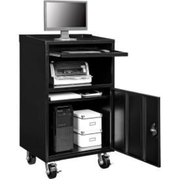 MOBILE COMPUTER CABINET, 27"W X 24"D X 49-1/2"H, BLACK, UNASSEMBLED PROVIDES SECURE STORAGE IN THE LOCKABLE 24-5/8"W X 22-7/8"D X 22-5/8"H LOWER CABINET. CPU SHELF ADJUSTS TO ACCOMMODATE EITHER TOWER OR DESKTOP STYLES. REAR CABINET ACCESS HOLES ARE PROVIDED. MIDDLE 11-1/2"H FIXED SHELF PROVIDES ROOM FOR PRINTER. THE SLIDE OUT KEYBOARD TRAY HAS A COMFORTABLE WRIST REST AREA TO REDUCE FATIGUE, 23"W X 21"D. ROLLS EASILY ON 5" POLYOLEFIN CASTERS (2 SWIVEL W/BRAKES, 2 RIGID). THE TOP SURFACE IS 47-3/4"H FOR CONVENIENT MONITOR VIEWING AND HAS 1-1/2"H BACK AND END STOPS TO KEEP ITEMS FROM ROLLING OFF. WIRE TIES AND MOUNTING HOLES PROVIDED FOR TIDY CABLE MANAGEMENT. DURABLE BAKED BLACK ENAMEL FINISH. ASSEMBLES EASILY. *ALSO AVAILABLE IN FULLY-ASSEMBLED UNIT (MODEL# 694561BKA).