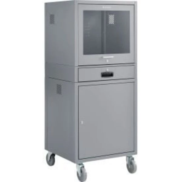 SECURE STEEL CABINET PREVENTS DATA THEFT AND VANDALISM BY LIMITING ACCESS TO COMPUTER, MONITOR AND KEYBOARD. UPPER COMPARTMENT HAS BREAK RESISTANT ACRYLIC WINDOW, FULLY RETRACTABLE LOCKING DOOR AND HOLDS UP TO 21" DIAGONAL LCD OR CRT MONITORS. SLIDE-OUT LOCKING KEYBOARD DRAWER AND ADJUSTABLE HEIGHT LOWER COMPARTMENT SHELF EXTEND FULLY ON BALL BEARING SLIDES. LOWER COMPARTMENT HAS LOCKING FRONT AND REAR ACCESS DOORS. HEAVY DUTY 5" SWIVEL CASTERS (2 LOCKING). TOP AND BOTTOM COMPARTMENTS ARE LOUVERED TO REDUCE HEAT BUILD UP AND INCLUDE CONVENIENT CABLE MANAGEMENT PORTS. ALL DOORS ARE KEYED ALIKE. OPTIONAL FAN KIT WITH 5'L POWER CORD REDUCES HEAT BUILD UP. ORDER ONE FAN FOR EACH UPPER, LOWER AND CPU SIDE CABINET. UPPER FRAME CONSISTS OF: 24-GAUGE PANELS, 19-GAUGE SLIDING KEYBOARD/MOUSE TRAY. LOWER FRAME CONSISTS OF: 23-GAUGE DOOR DOOR FRAME, 23-GAUGE SIDE BOTTOM PANELS, 20-GAUGE DRAWER THICKNESS. DURABLE DARK GRAY POWDER COATED FINISH. EASY ASSEMBLY. 1 YEAR LIMITED WARRANTY. DIMENSIONS: <ul> UPPER COMPARTMENT INTERIOR: 24-1/4"W X 21-3/4"D X 21"H LOWER COMPARTMENT INTERIOR: 20-3/4"W X 21"D X 23-1/4"H LOCKING SLIDE-OUT KEYBOARD DRAWER: 19-1/2"W X 17-3/4"D X 4-1/4"H MONITOR WINDOW OPENING: 14-3/4"W X 15-3/4"H OVERALL UNIT: 24-1/2"W X 22-1/2"D X 60-3/8"H WEIGHT CAPACITY OVERALL: 175 LBS. WEIGHT CAPACITY FOR KEYBOARD TRAY: 40 LBS. OPTIONAL ACCESSORIES (SOLD SEPARATELY): <ul> SIDE SHELF KIT (SET OF 2): ITEM# 237368DG AC FAN KIT: ITEM# 249189, ORDER ONE FOR EACH CABINET SLIDING MOUSE TRAY: ITEM# 273113 CPU SIDE CABINET: ITEM# 253700GY PLEASE NOTE: CANNOT INSTALL BOTH SIDE SHELF AND CPU SIDE CABINET TO ONE SIDE OF COMPUTER CABINET.</ul></ul>