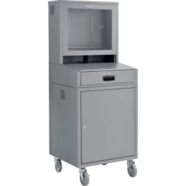 THIS STEEL MOBILE SECURITY COMPUTER CABINET ENCLOSURE IS DESIGNED TO HOLD LCD FLAT PANEL MONITORS UP TO 24" DIAGONAL AND PHYSICALLY HELPS PROTECT YOUR COMPUTER EQUIPMENT AND DATA FROM SURROUNDING HAZARDS, VANDALISM, AND INSIDER HACKS. THIS MOBILE SECURITY COMPUTER CABINET IS PERFECT FOR BUSINESSES THAT WISH TO CONFORM TO PAYMENT CARD INDUSTRY (PCI) COMPLIANCE WITH PHYSICAL PROTECTION. ALSO PERFECT FOR USE AT CONSTRUCTION, MANUFACTURING FACILITIES OR PUBLIC USE. THE LOCKING MONITOR COMPARTMENT INCLUDES A BREAK-RESISTANT WINDOW FRAMED IN HEAVY-DUTY 20 GAUGE STEEL. WINDOW PANEL IS REMOVABLE WHICH GIVES EASY ACCESS TO TOUCH SCREEN MONITORS. THE COMPUTER CABINET UNIT COMES WITH A CONVENIENT SLOPED WRITING SURFACE AND 2 ORGANIZING COMPARTMENTS FOR 8-1/2" X 11" PAPERS. KEYBOARD/OPTIONAL MOUSE TRAY AND HEIGHT ADJUSTABLE PRINTER SHELF EXTEND FULLY ON STEEL BALL BEARING SLIDES. LOWER COMPARTMENT HAS FRONT AND REAR DOORS. CABLE MANAGEMENT OPENINGS THROUGHOUT. REAR PANELS ARE LOUVERED TO REGULATE HEAT. MOVES ON 4 INDUSTRIAL SWIVEL CASTERS (2 WITH BRAKES). DARK GRAY POWDER COAT FINISH. OPTIONAL FAN WITH 5'L POWER CORD REDUCES HEAT BUILD UP. ORDER ONE FAN FOR EACH UPPER, LOWER AND SIDE CAR CABINET. OPTIONAL SIDE SHELVES, SIDE CAR CABINET, FAN AND SLIDING MOUSE TRAY SOLD SEPARATELY. 1 YEAR LIMITED WARRANTY. ALSO AVAILABLE IN FULLY-ASSEMBLED UNIT (MODEL# 239115GYA). DIMENSIONS:<ul> UPPER COMPARTMENT INTERIOR 24"W X 9"D X 19-1/4"H LOWER COMPARTMENT INTERIOR 20-3/4"W X 21"D X 23-1/4"H LOCKING SLIDE-OUT KEYBOARD DRAWER 19-1/2"W X 17-3/4"D X 2-1/4"H OVERALL UNIT 24-1/2"W X 22-1/2"D X 62-3/4"H PIGEON HOLE COMPARTMENTS 11"W X 9"D WORK SURFACE 24-1/2"W X 13"D MONITOR WINDOW OPENING 18-1/2"W X 15"H OPTIONAL ACCESSORIES (SOLD SEPARATELY):<ul> SIDE SHELF KIT (SET OF 2): ITEM# 237368DG AC FAN KIT: ITEM# 249189, ORDER ONE FOR EACH CABINET SLIDING MOUSE TRAY</ul></ul>