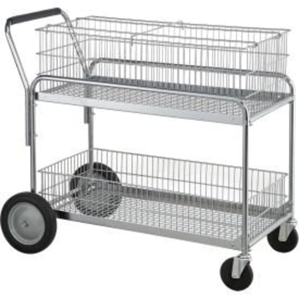 STANDARD MAIL AND OFFICE FILE CART KEEP MAIL AND OFFICE FILES ORGANIZED WITH OUR DELUXE MAIL CARTS. THIS CHROME-PLATED WIRE SHELF MAIL CARRIER CART HAS A CAPACITY OF 200 LBS. AND INCLUDES RAILS FOR HANGING FILE FOLDERS. OUR MOBILE FILE CART ALSO COMES EQUIPPED WITH REMOVABLE UPPER AND LOWER CHROME-PLATED WIRE BASKETS. REMOVABLE, LIFT-OUT BASKETS FOR EASY LOADING AND FILING ENJOY LASTING PERFORMANCE WITH A HEAVY-DUTY 18-GAUGE X 1" DIAMETER TUBULAR STEEL CONSTRUCTION WITH A DURABLE CHROME-PLATED FINISH. EXCELLENT MOBILITY ON TWO 5" DIAMETER RUBBER SWIVEL CASTERS AND TWO 10" SEMI-PNEUMATIC WHEELS. INCLUDES RAILS FOR HANGING FILES. CUSHIONED PUSH HANDLE FOR COMFORT. EASY ASSEMBLY. THIS STANDARD MAIL CART'S UPPER AND LOWER BASKETS MEASURE 25"L.