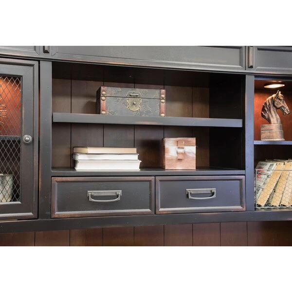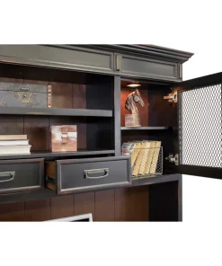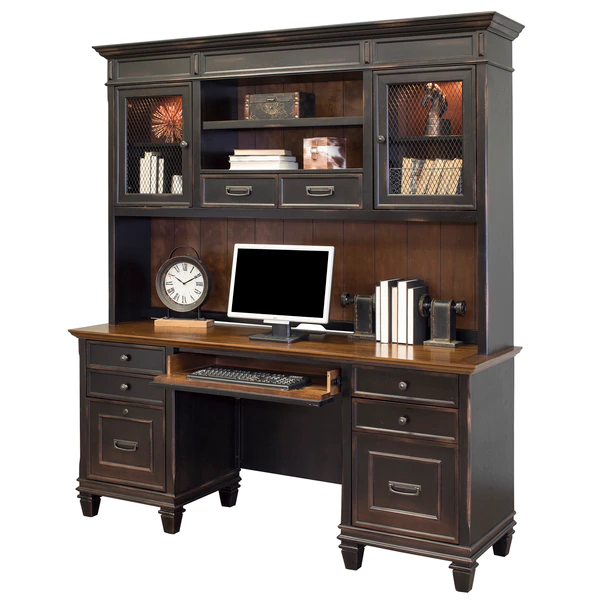 The classic style elements of the Hartford credenza makes it a perfect addition to any home. The credenza includes drop front keyboard pencil drawer, three utility drawers, one locking letter/legal file drawer, faux drawer door with printer pullout, and a power center with two AC power outlets and three USB 2.0 connections.