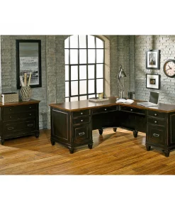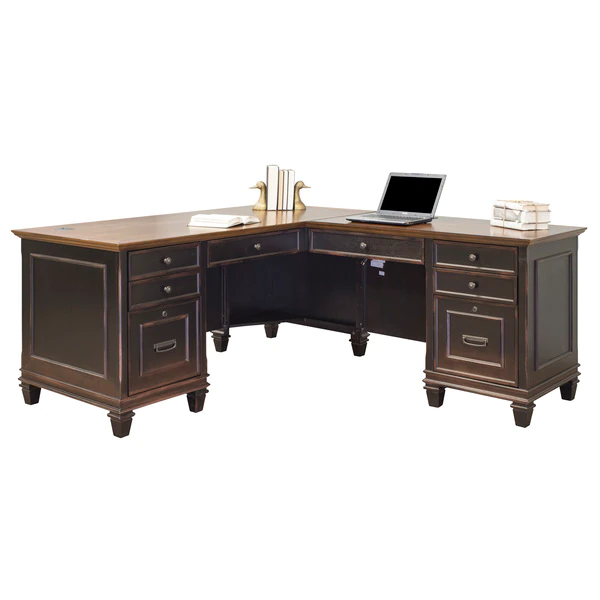 The classic style elements of the Hartford right hand facing Pedestal l desk makes it a perfect addition to any home. The right hand facing Pedestal l desk includes drop front keyboard/pencil drawer, two utility drawers with dividers, one locking letter legal file drawer, and two wire management grommets. It is finished on all sides.