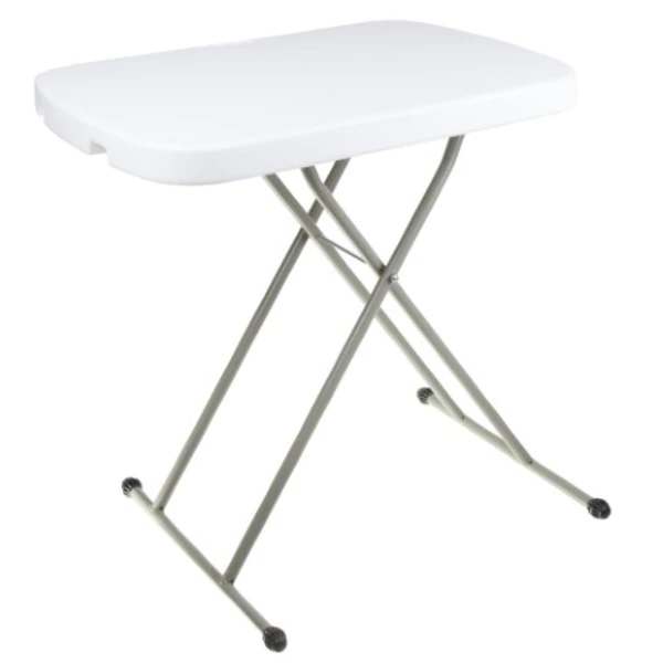 The 26-inch long Folding Utility Table and TV Tray from Hastings Home is ready to go wherever you need it, from crafty creations at home, to the sidelines of an outdoor event, or in front of your favorite chair as a portable desk. This easy to clean table features a sturdy plastic tabletop with impact resistant corners and a powder-coated steel base that adjust the height of the stand to 21, 24, or 27-inches tall. The foldable design of this multifunctional table allows you to open the table for set up at the beach, a tailgate, backyard barbeque, and camping, then collapse it back down for compact storage or transport in the trunk of a car.