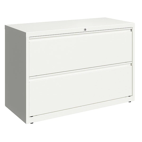 Lateral File Cabinet, File Cabinet Type Lateral, Series HL8000, File Size A4/Legal/Letter, Number of Drawers 2, Number of Doors 0, Overall Width 42 in, Overall Height 28 in, Overall Depth 18 5/8 in, Finish Powder Coated, Color White, Material Steel, Handle Type Full-Width Drawer Pulls, Label Holder Included Yes, Lock Included Yes, Assembled, Standards ANSI/BIFMA, TAA Compliant, Includes Hang Rails