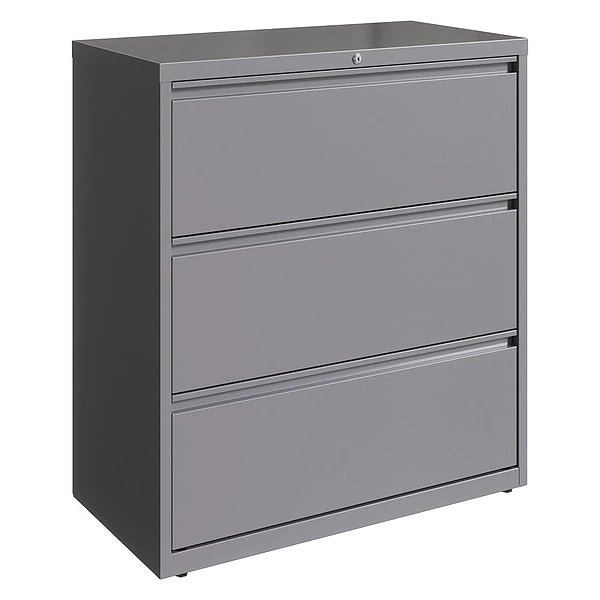 Lateral File Cabinet, File Cabinet Type Lateral, Series HL8000, File Size A4/Legal/Letter, Number of Drawers 3, Number of Doors 0, Overall Width 36 in, Overall Height 40 1/4 in, Overall Depth 18 5/8 in, Finish Powder Coated, Color Arctic Silver, Material Steel, Handle Type Full-Width Drawer Pulls, Label Holder Included Yes, Lock Included Yes, Assembled, Standards ANSI/BIFMA, TAA Compliant, Includes Hang Rails